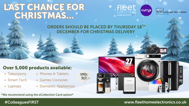 Monday 8th DecemberApplications for Fleet Home Electronics requests need to be placed by Thursday 18th December at the latest to guarantee the approval checks are complete in time to receive your e-Collection card for Christmas. For more information, browse the available products on the Fleet Electronics website. The VPD code is 317.